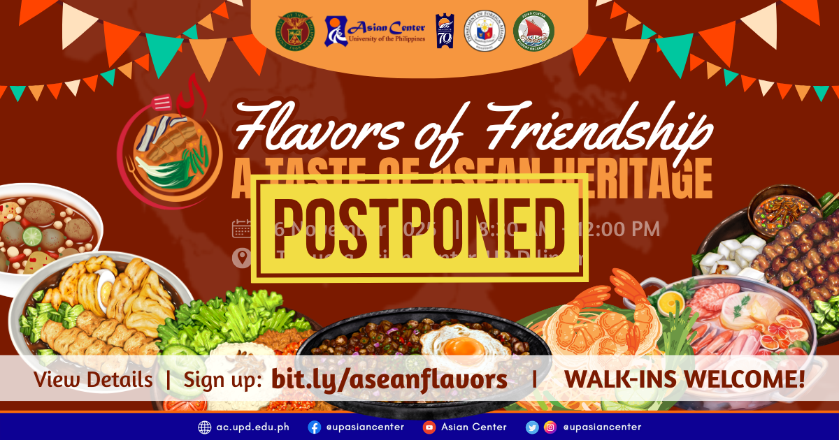 The UP Asian Center's on-site gastronomic fair, "Flavors of Friendship: A Taste of ASEAN Heritage" has been POSTPONED INDEFINITELY. The event will remain free and open to all.