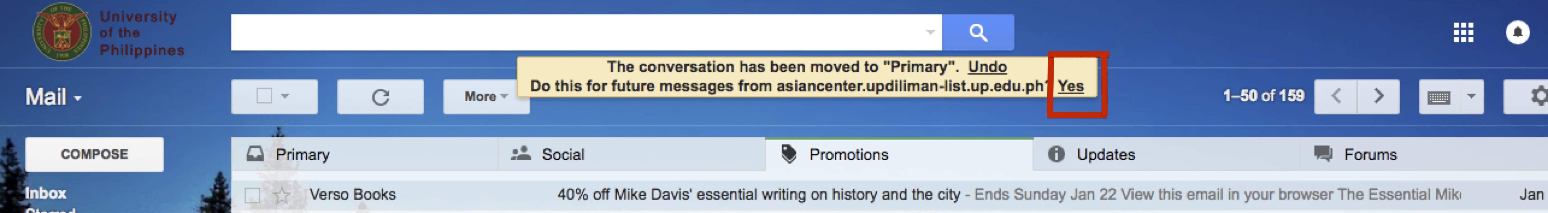 - Step (2) Select “Yes” when prompted “Do this for future messages from asiancenter.updiliman-list.up.edu.ph?” VIEW SCREENSHOT for GUIDANCE